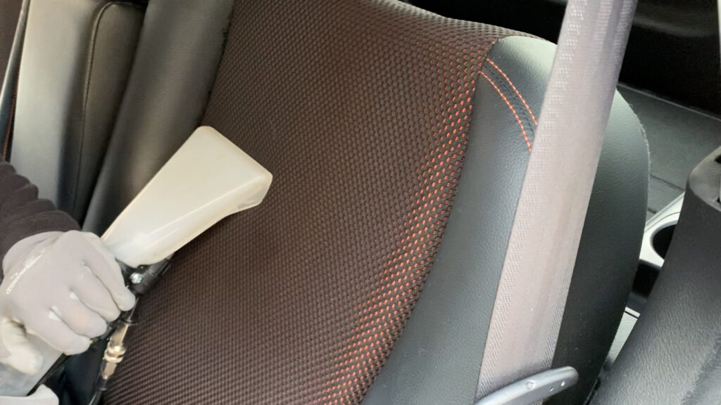 年数は経っていますがとてもきれいに乗られているお車です。しかし、シートには目に見えない汚れが詰まっています。表面の汚れを吸い取り、洗浄液をかけてブラシで馴染ませ、汚れを吸い取っていきます。